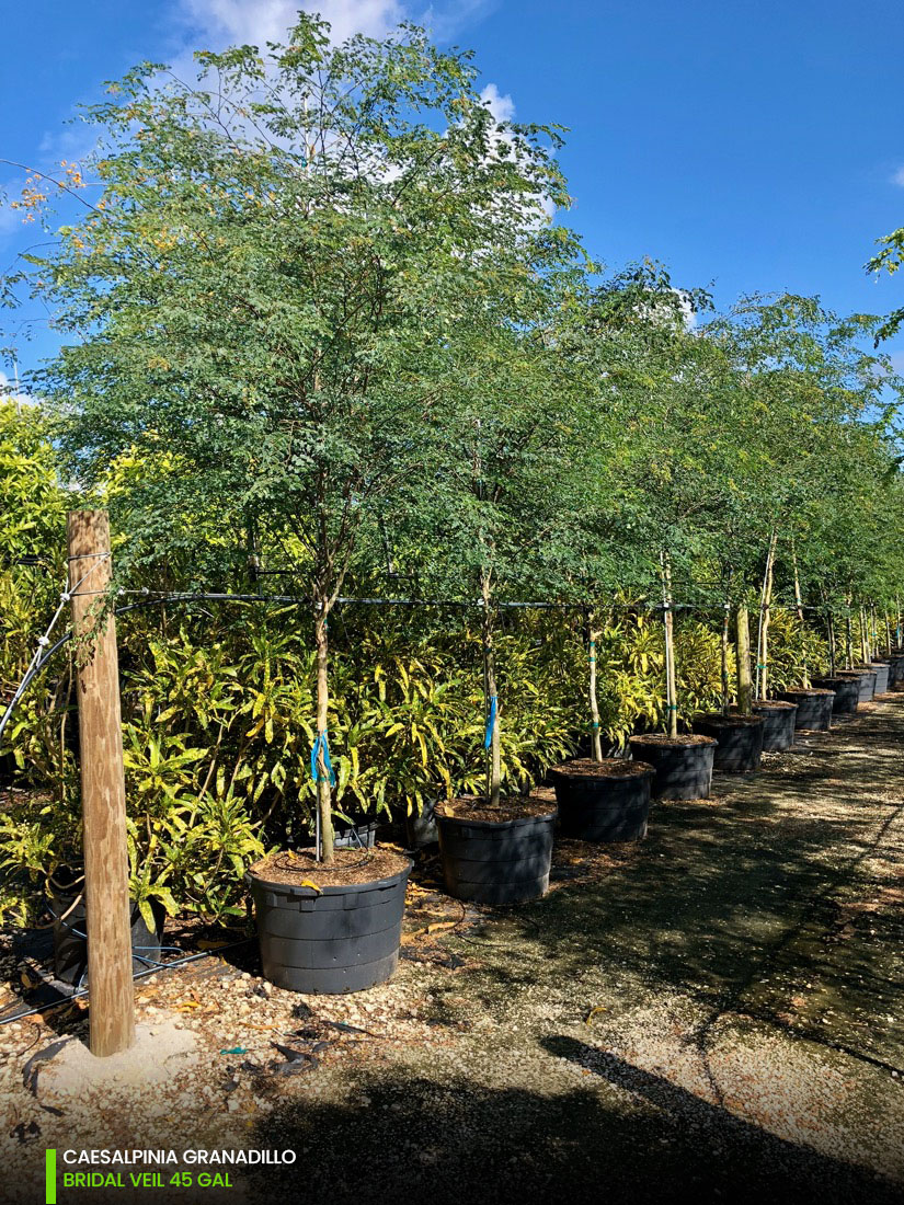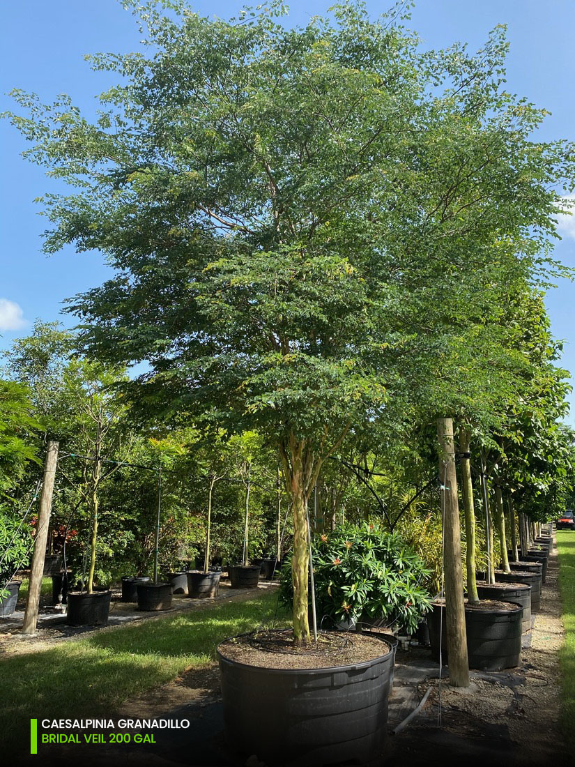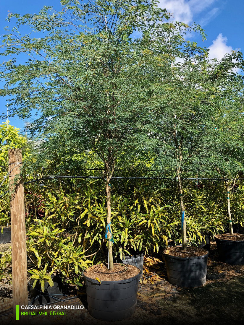 So, if you’re investing on a change, and looking into adding magic to your landscape, the Bridalveil tree (Caesalpinia Granadillo) is your go to tree. Structure, texture, daunting foliage, alluring appeal; this tree really has it all. And the best of all you can find it at TreeWorld with the quality that sets us apart. We grow the Caesalpinia Granadillo from 25 gallons, 45 gallons, 65 gallons, 100 gallons, 200 gallons and 300 gallons; as single trunk or multi-trunk. Check out specification chart for average measurements.