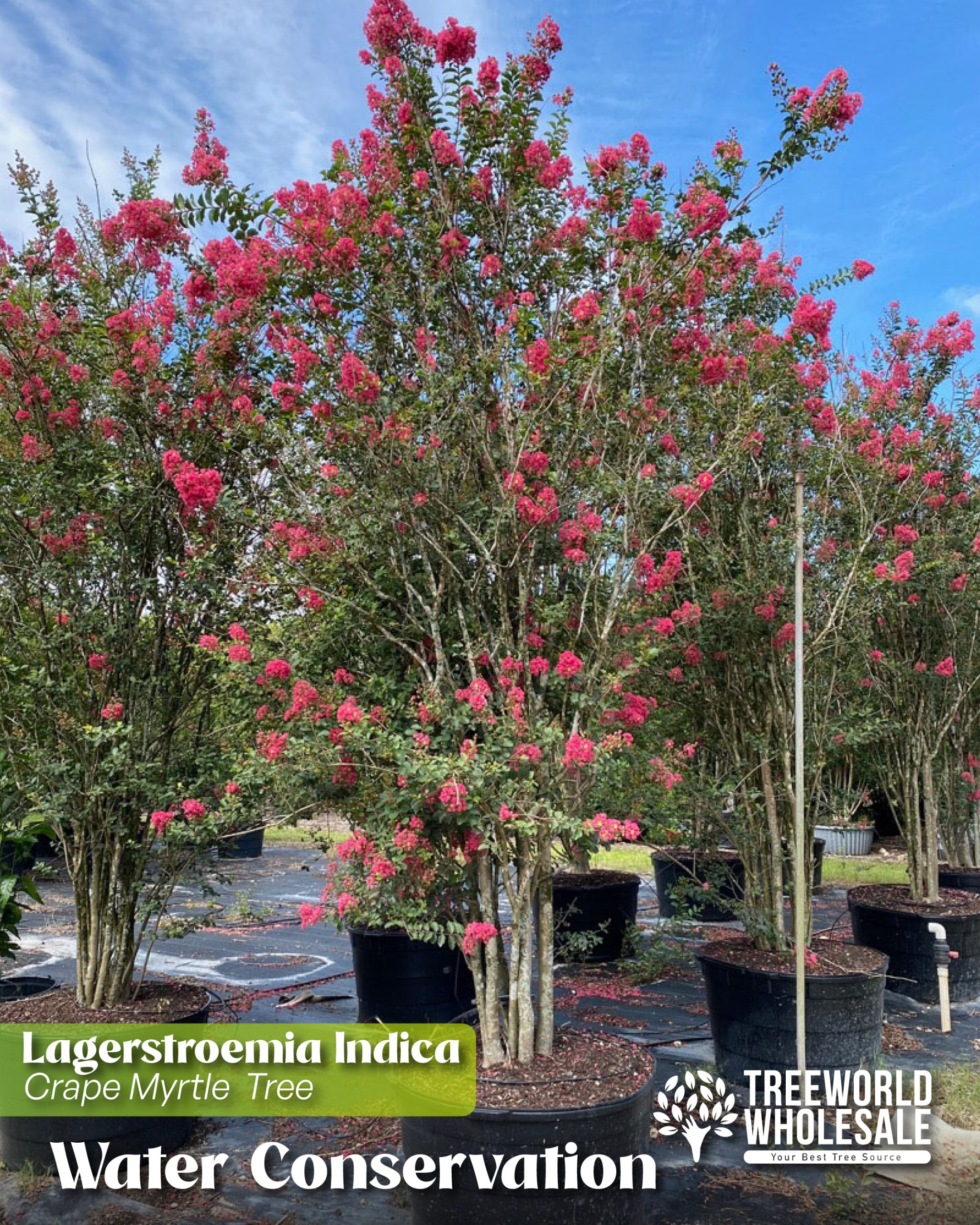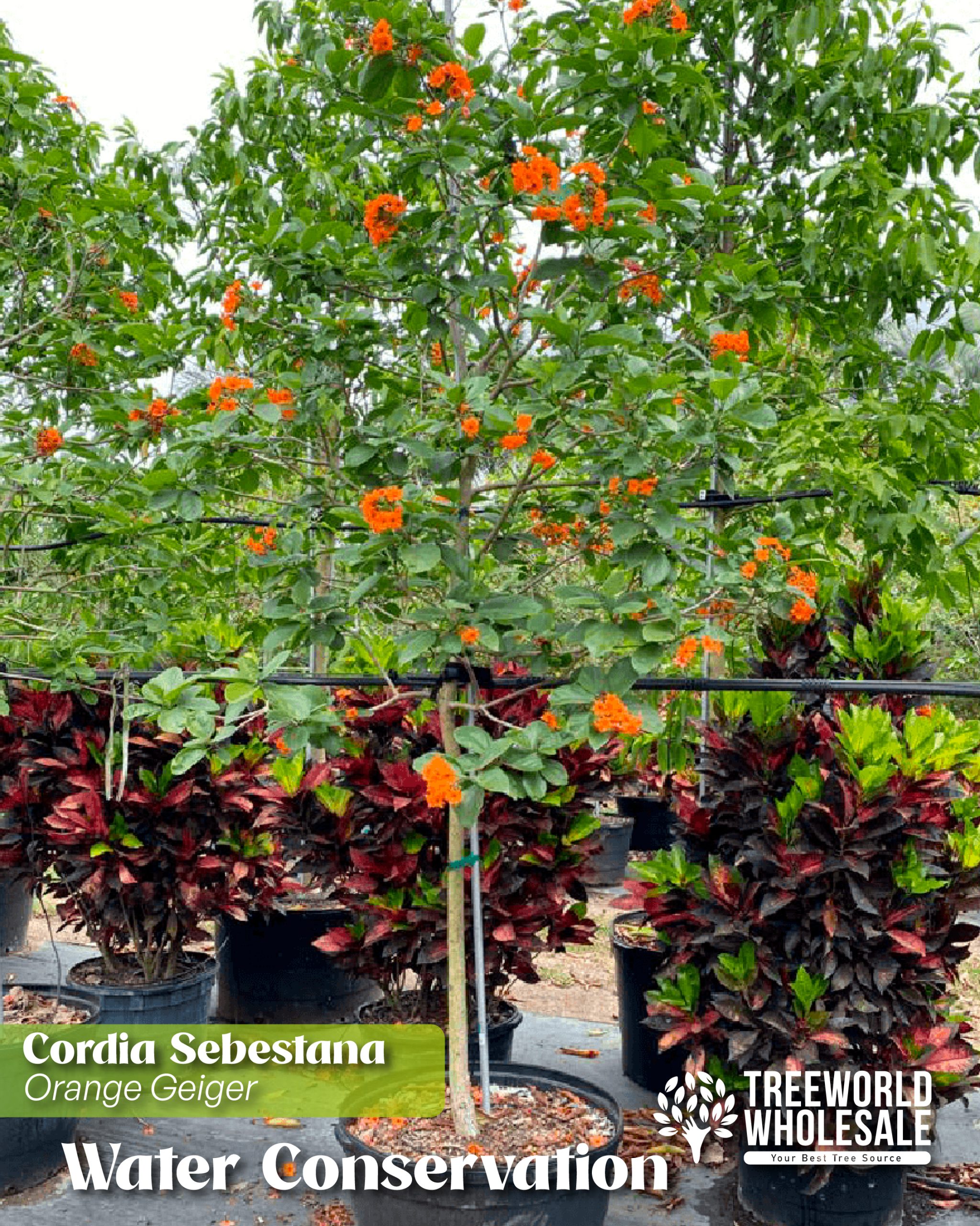 Choose high-drought-tolerant trees that will require less water, like Cordia sebestena (Orange Geiger Tree). It is an excellent choice for coastal landscape design due to its combination of attractive appearance, drought tolerance, and resilience. Once established, it is known to be highly drought-tolerant, requiring minimal watering. An ideal choice for water-efficient landscapes. Additionally, it is well-suited to areas with irregular rainfall and can thrive in sandy, well-drained soils, such as coastal regions. Another top choice is the Jerusalem thorn or Palo verde tree (Parkinsonia aculeata), famous for its green bark and bright yellow flower, iconic in desert landscapes, and the Crape Myrtles (Lagerstroemia indica), also known for their drought resistance.