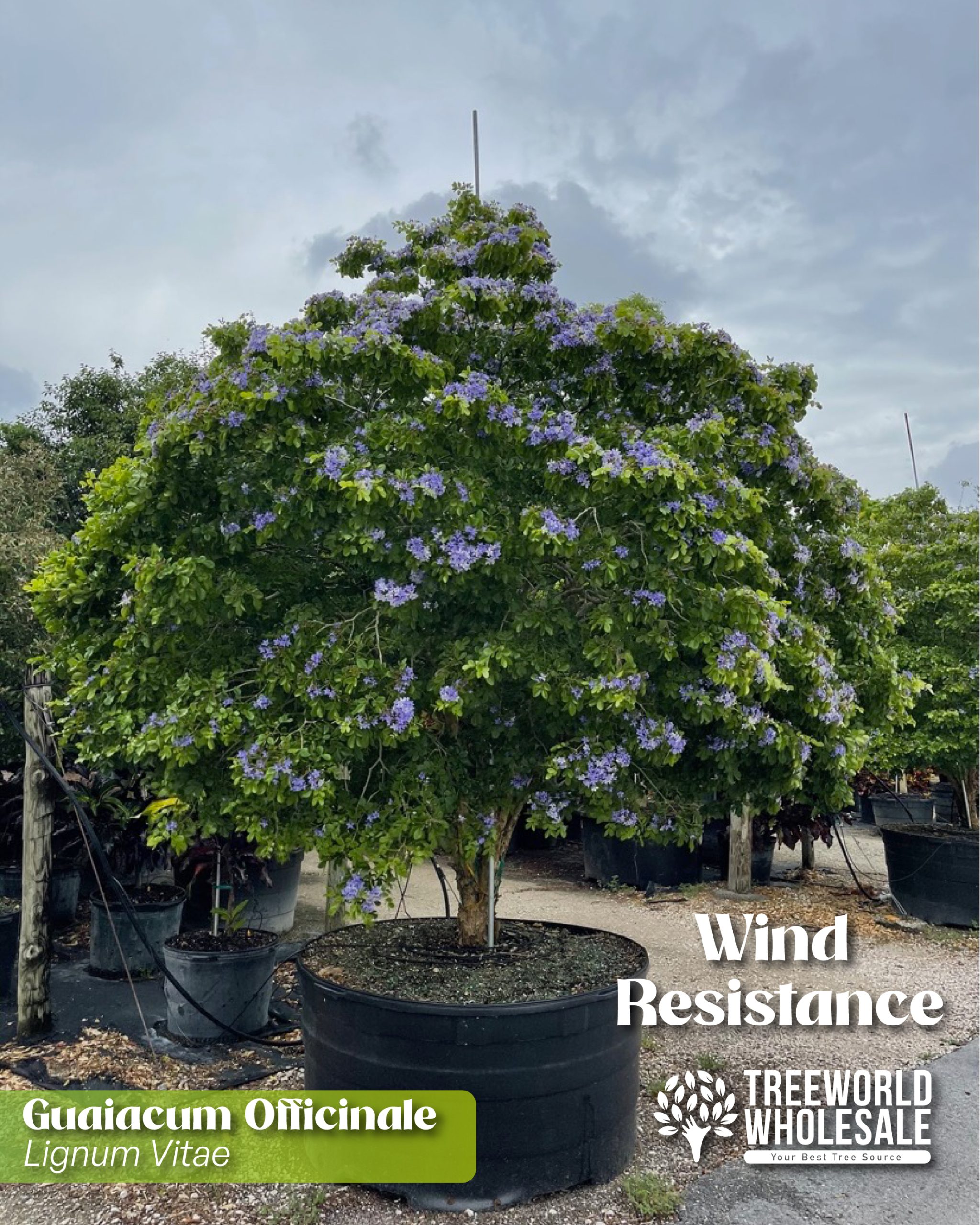 Another two excellent wind-resistant options are the Guaicum Offcinale, best known as the "tree of life," and our native Eugenia Rhombea, the red stopper.