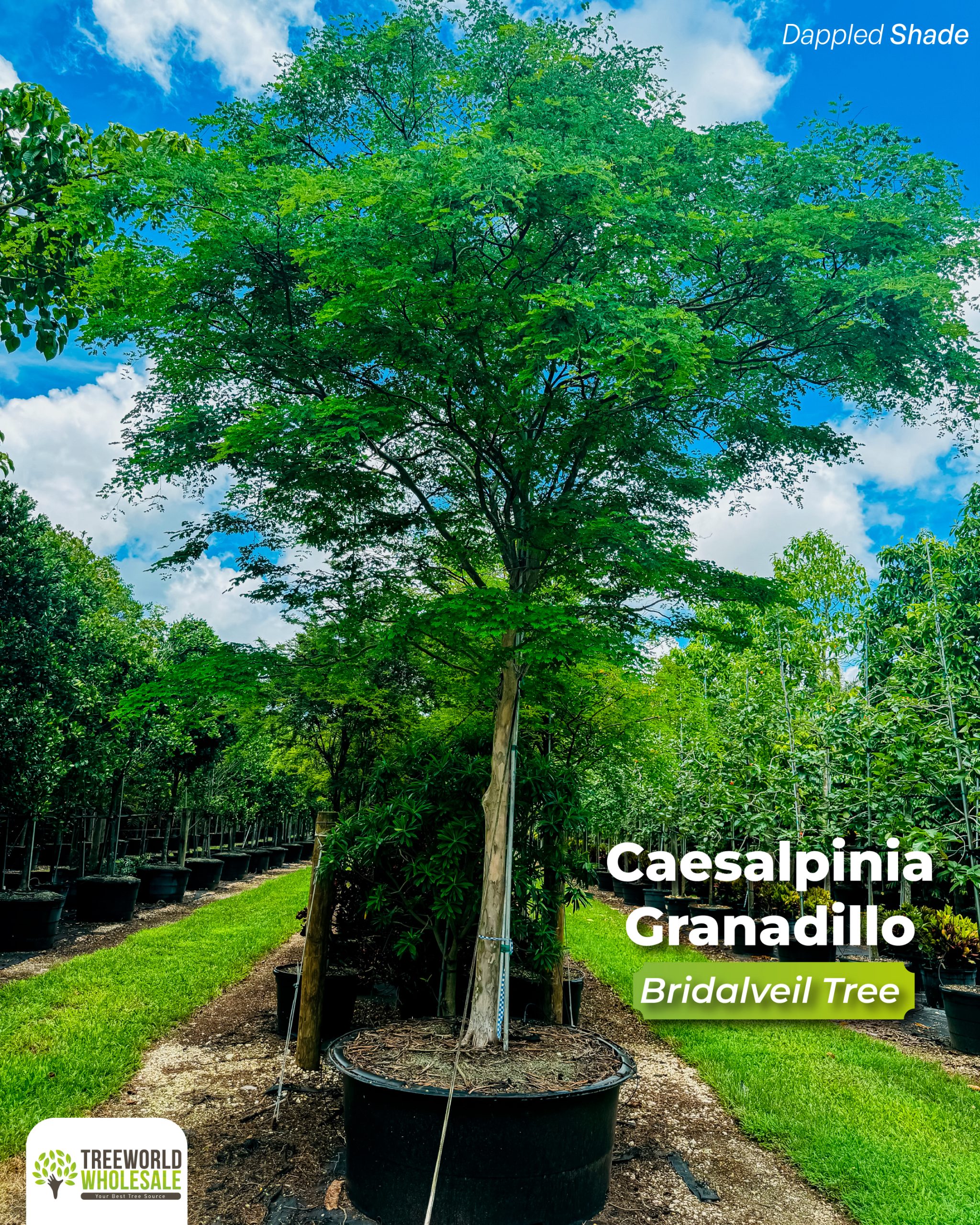One of our top sellers is the Caesalpinia Granadillo, or, as it is well known, the Bridalveil tree. This medium-sized evergreen tree is a standout in the garden. It typically reaches a height of 30 feet. Thanks to its upright spreading branches, the Granadillo develops an open crown with a striking vase-shaped top. The foliage, its most remarkable feature, bears a resemblance to the delicate embroidery of a bridal veil, thus its common name. With pinnately compound leaves in a feather-like pattern, contributing to its unique appearance and identity. It skillfully manipulates sunlight to create the most exquisite dappled shade, transforming into an enchanting sight in the landscape.