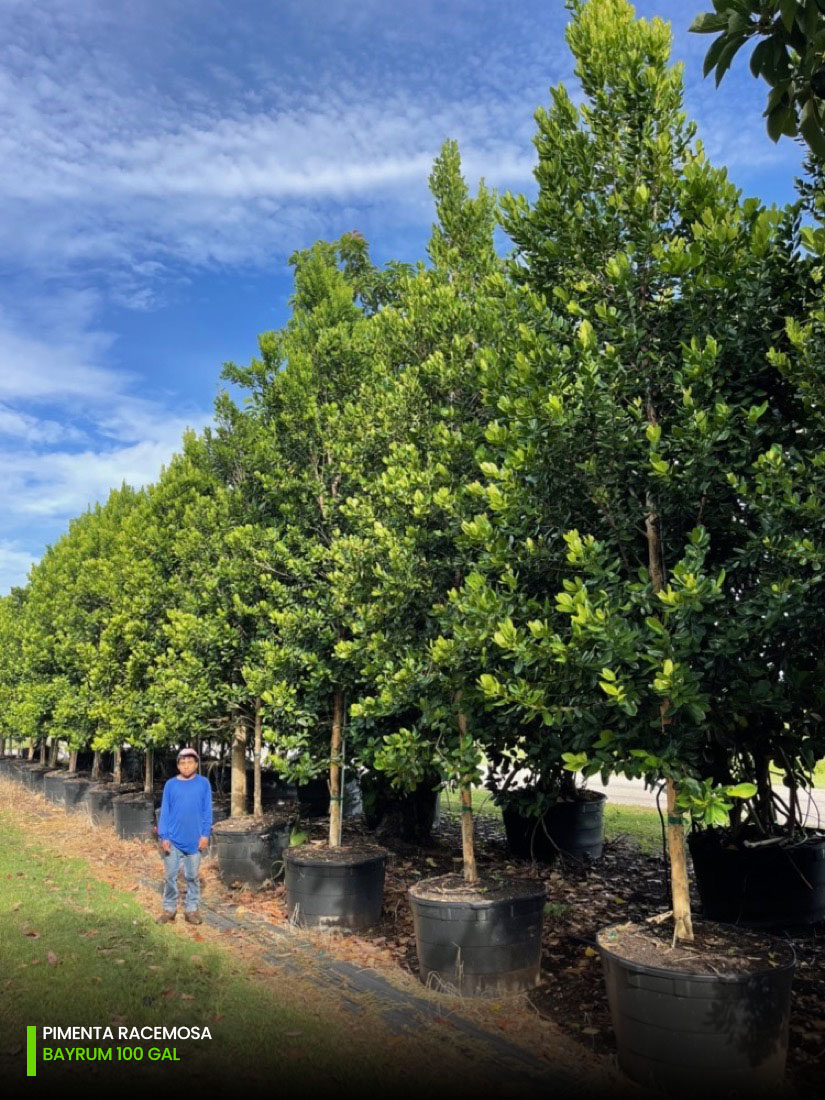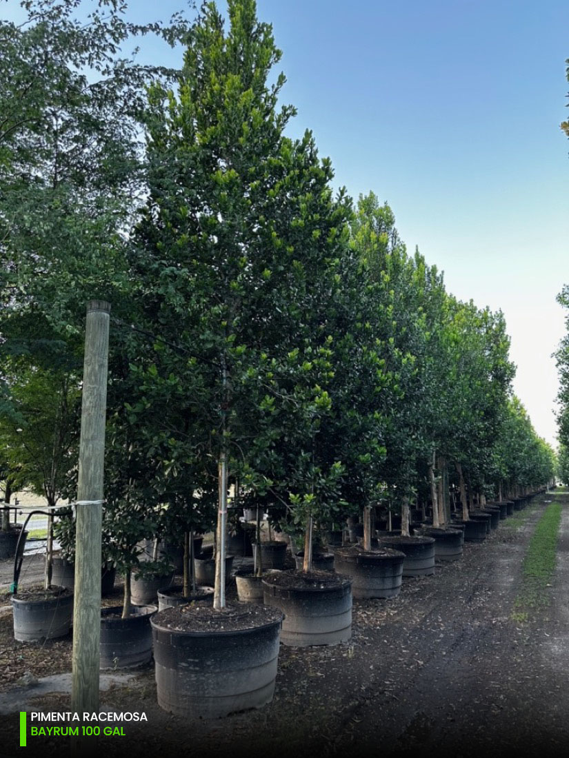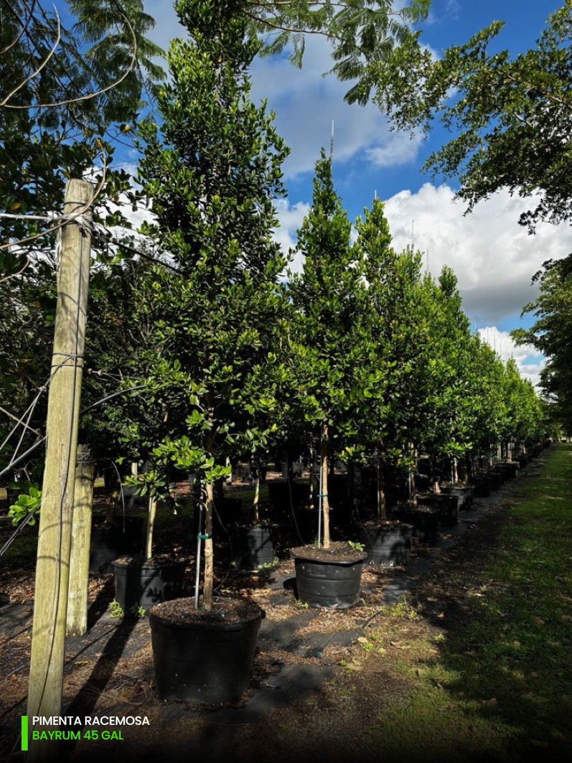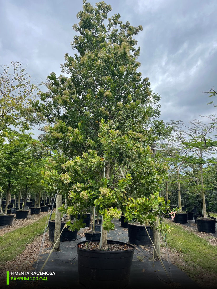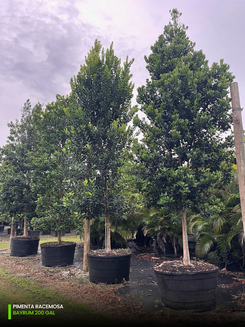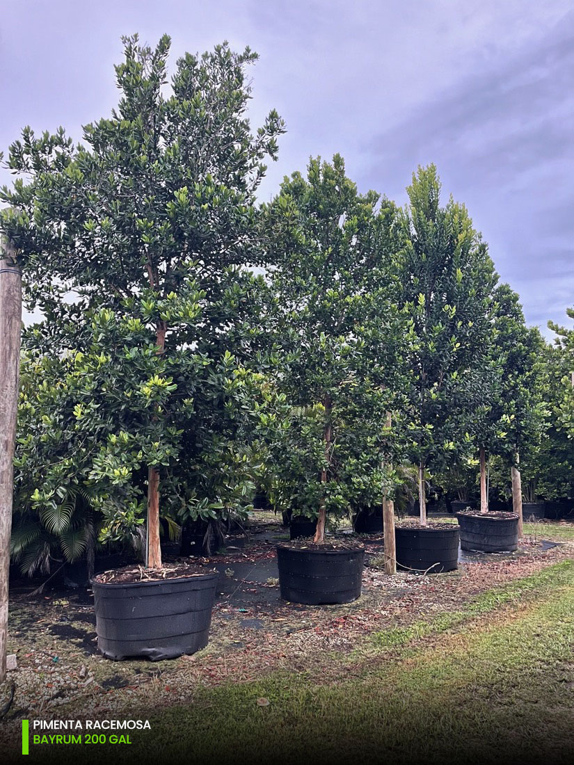 At our tree farms we have Pimenta Racemosa multi-trunk and single trunk (std) starting at 25 gallons, 45 gallons, 65 gallons, 100 gallons, 200 gallons and 300 gallons. You can check out the full specifications chart on the following link.