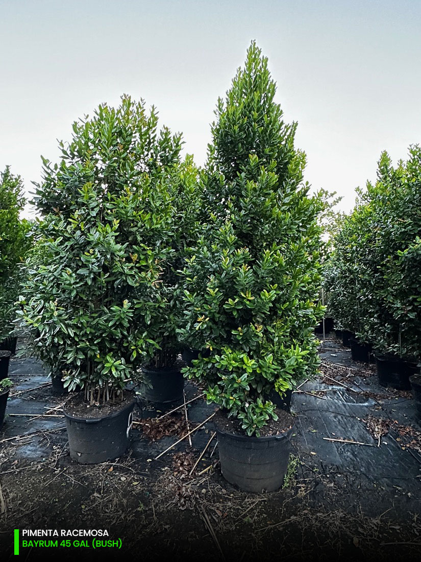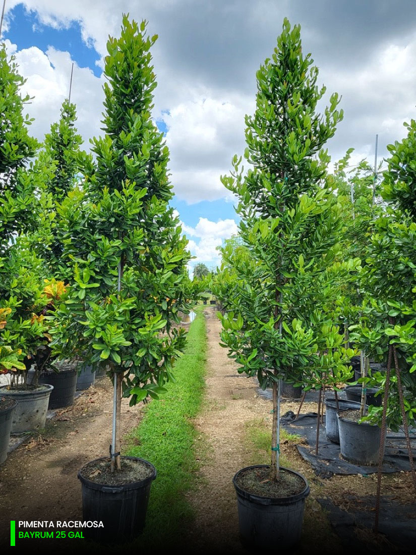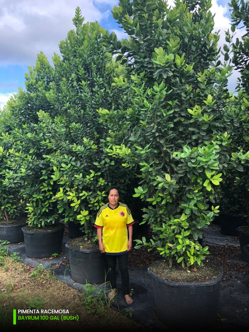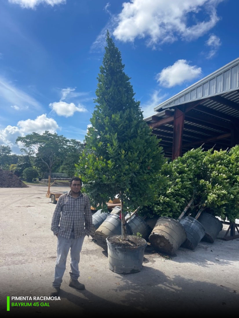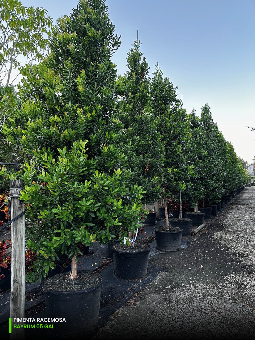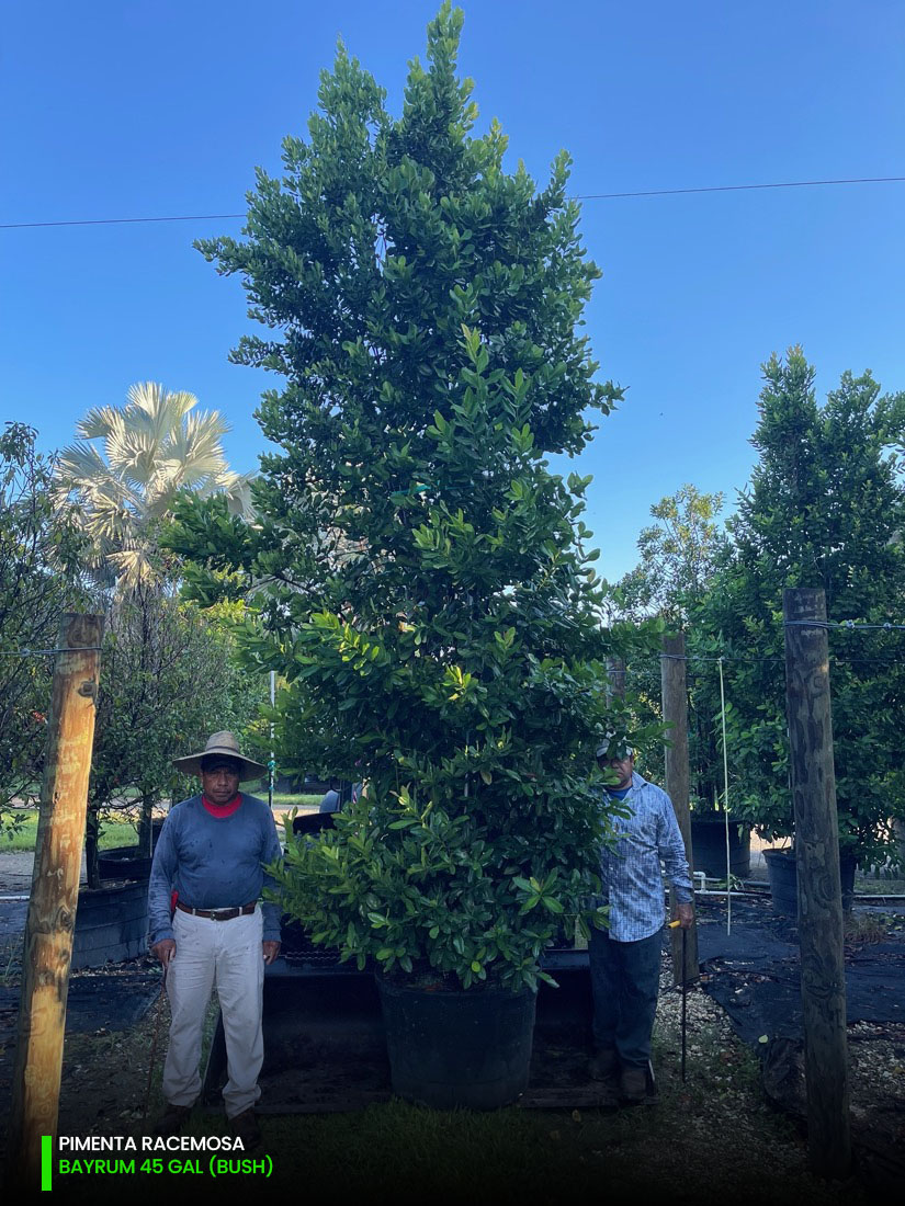 At our tree farms we have Pimenta Racemosa multi-trunk and single trunk (std) starting at 25 gallons, 45 gallons, 65 gallons, 100 gallons, 200 gallons and 300 gallons. You can check out the full specifications chart on the following link.
