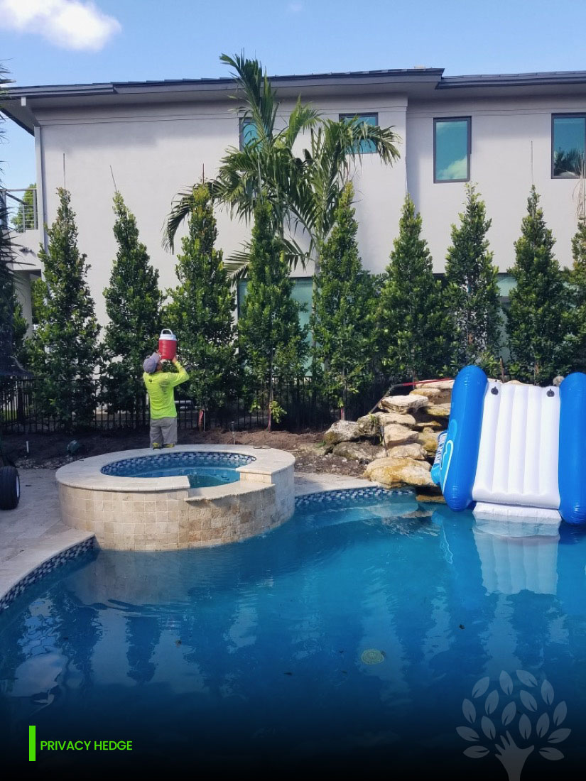 The pimenta racemosa is actually one of our top privacy hedges! This evergreen has become a quite the element when it comes to building privacy hedges. Especially grown with multiple trunks and branching to the ground to achieve the most density.