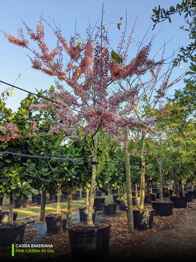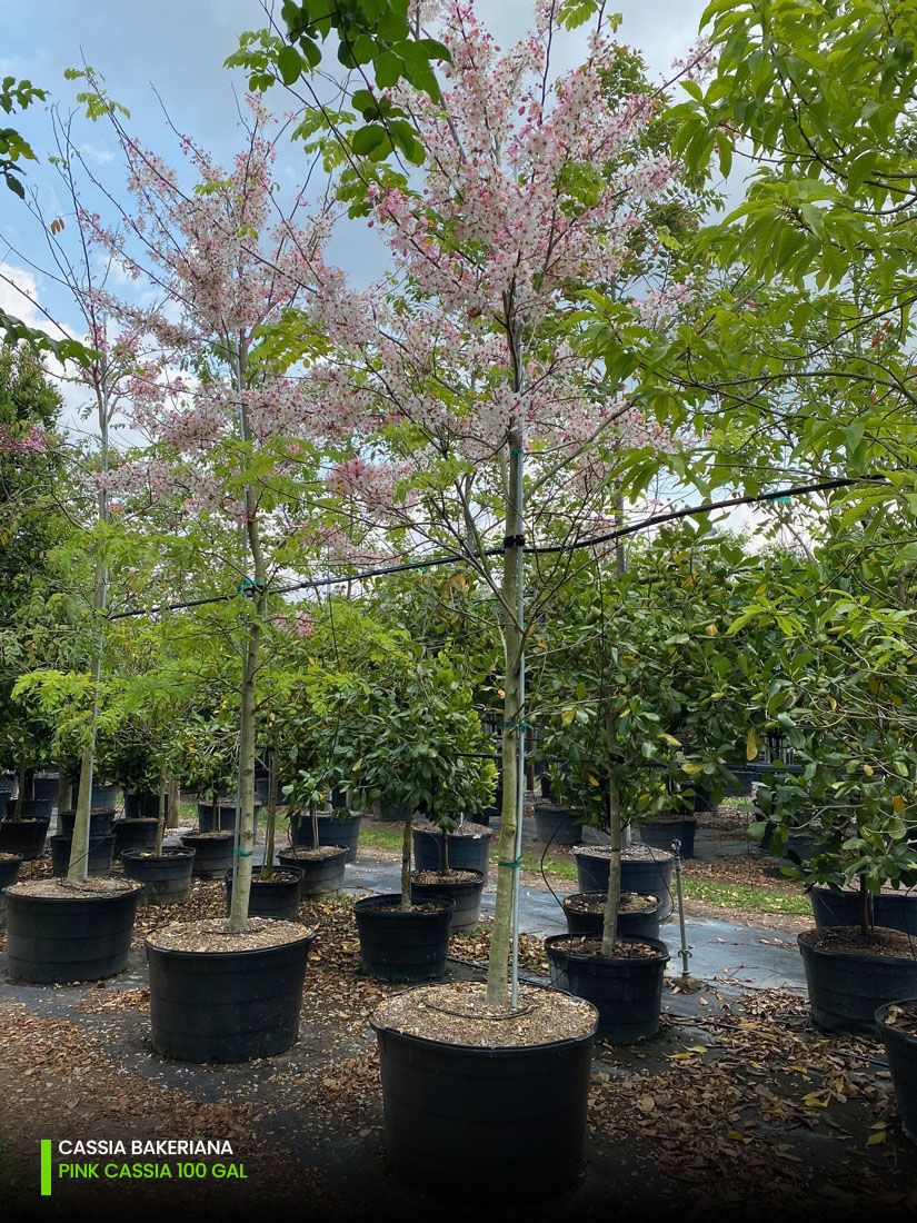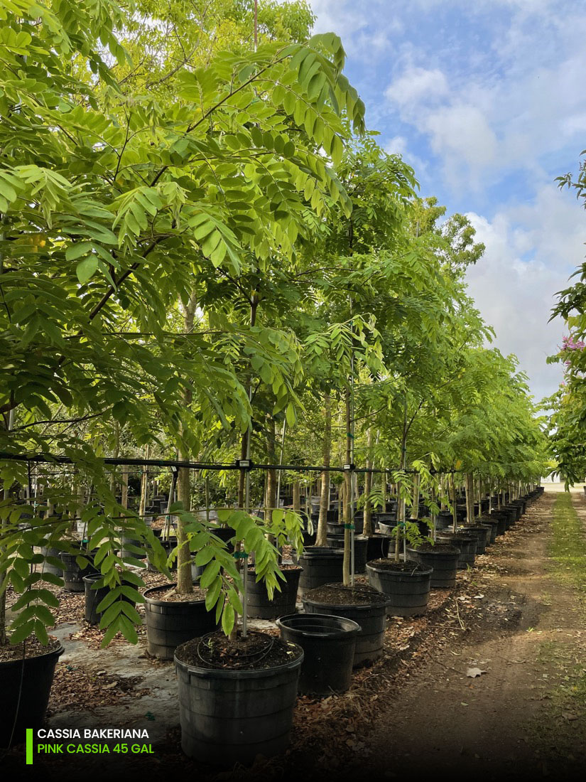 Find them all at our headquarters in Homestead, Florida, in our regular sizes of 25, 45, 65, 100, 200, and 300 gallons. We have quite a varied selection of Cassia trees at your disposal for you to choose from, so please contact us or call us at (305) 968-2427 if you have further questions.
