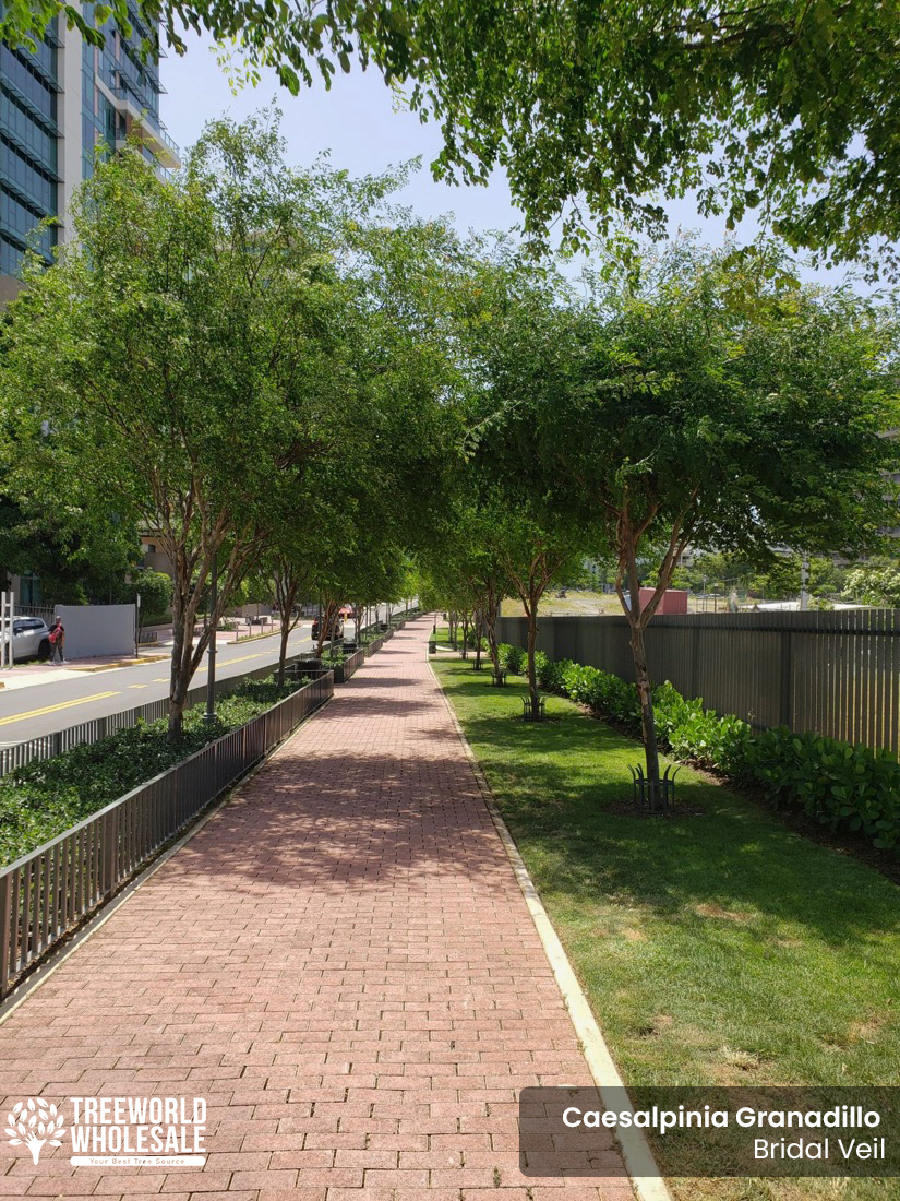 The Caesalpinia Granadillo grows in a range of soil types that are well-drained. It has no pests or diseases of concern, making it a great fit for south Florida and the Caribbean. You can certainly find them at our nursery as we grow the Bridal Veil from 25 gallons, 45 gallons, 65 gallons, 100 gallons, 200 gallons, and 300 gallons, as a single trunk (STD) or multi-trunk.