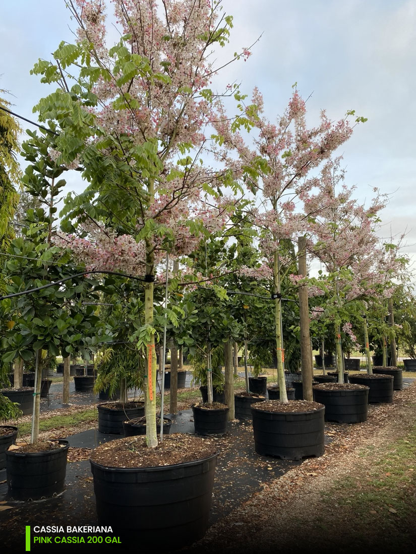 Furthermore, other aspects to have in mind if you’re considering the pink shower cassia (Cassia Bakeriana) for your project is that it is a full-sun lover, of a fast growth rate and a wide canopy. A great performer in the South Florida and the Caribbean climate. Find it at TreeWorld in 25, 45, 65, 100, 200 and 300 gallons.