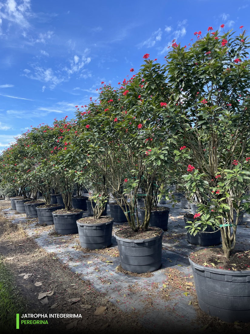 Of course, red couldn’t miss the beat! This exciting color has its own representation in this short spring blooming selection with the Peregrina (Jatropha Integerrima). This evergreen beauty, with eye-catching glossy bronze foliage. And the most stunning bright scarlet to vermillion color blooms, that measure 1 inch wide; quite breathtaking and resemble stars. Making this tree a perfect addition!