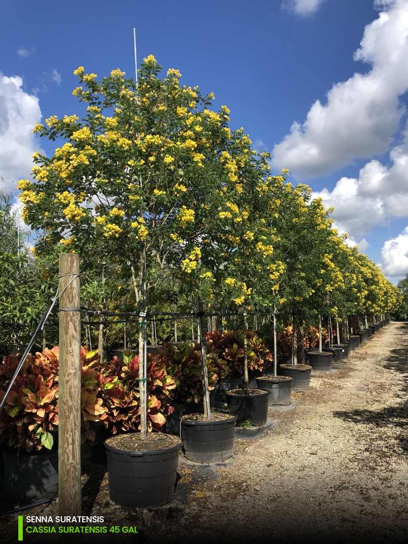 Straight from the pacific (Asia & Australia) but performing great in South Florida and the Caribbean! The Senna surattensis (Cassia surattensis) is a complete sensation as it blooms on a year-round basis guaranteeing tons on color. Flowers are borne in upright clusters at branch ends tend to cover the wide canopy of this small tree. With 1-1 1/2 inches wide yellow-blooms that burst into life in the most vibrant way! Attracting bees and butterflies. Other blooming sennas in the spring are the senna polyphylla and the senna Mexicana.