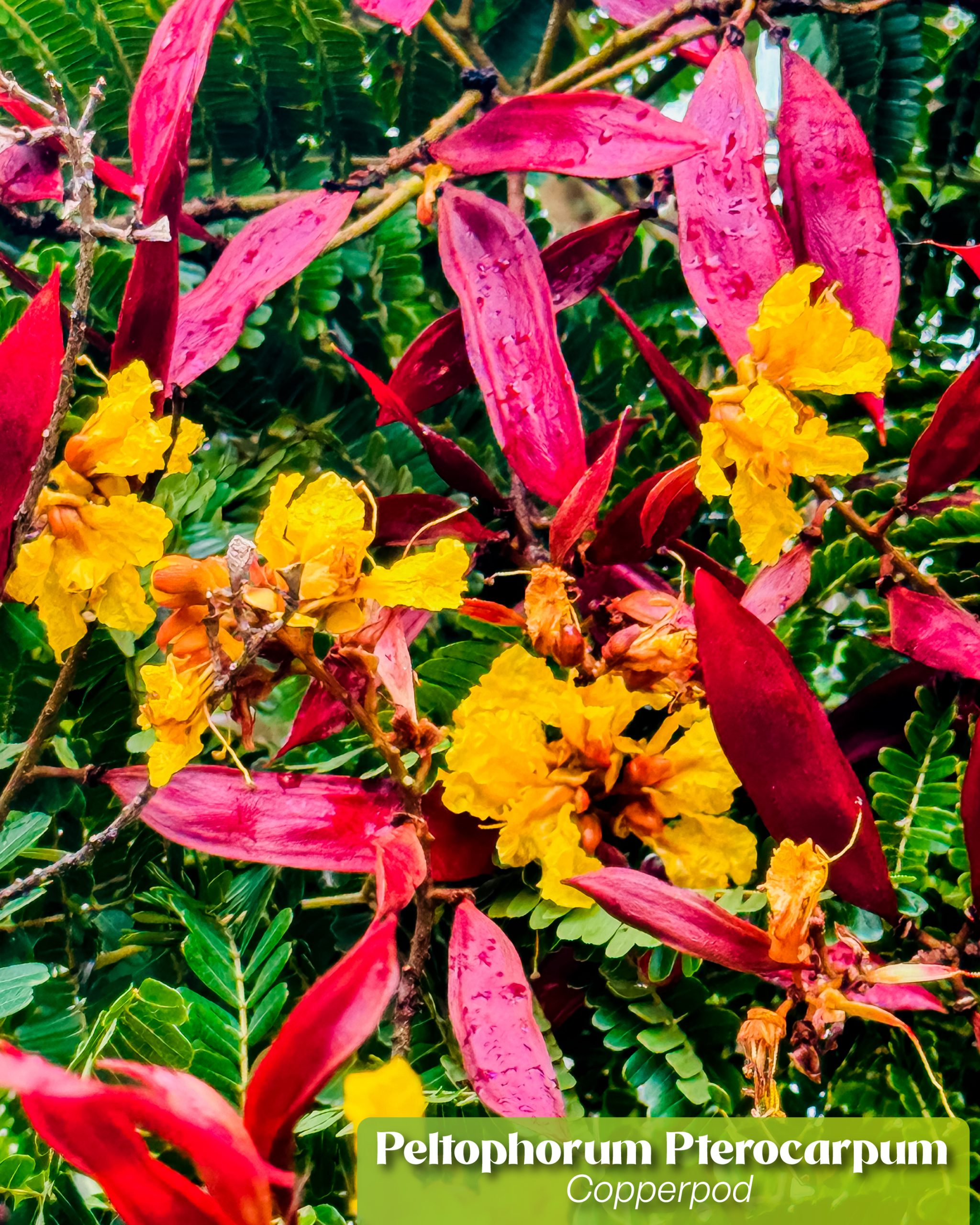 If you’re after a fast-growing shade tree with yellow flowers that also puts on a sunny show, Copperpod is one to keep an eye on. Native to Southeast Asia and loved across tropical regions, it’s known for its wide canopy, soft fern-like leaves, and big sprays of golden-yellow flowers that really turn heads.