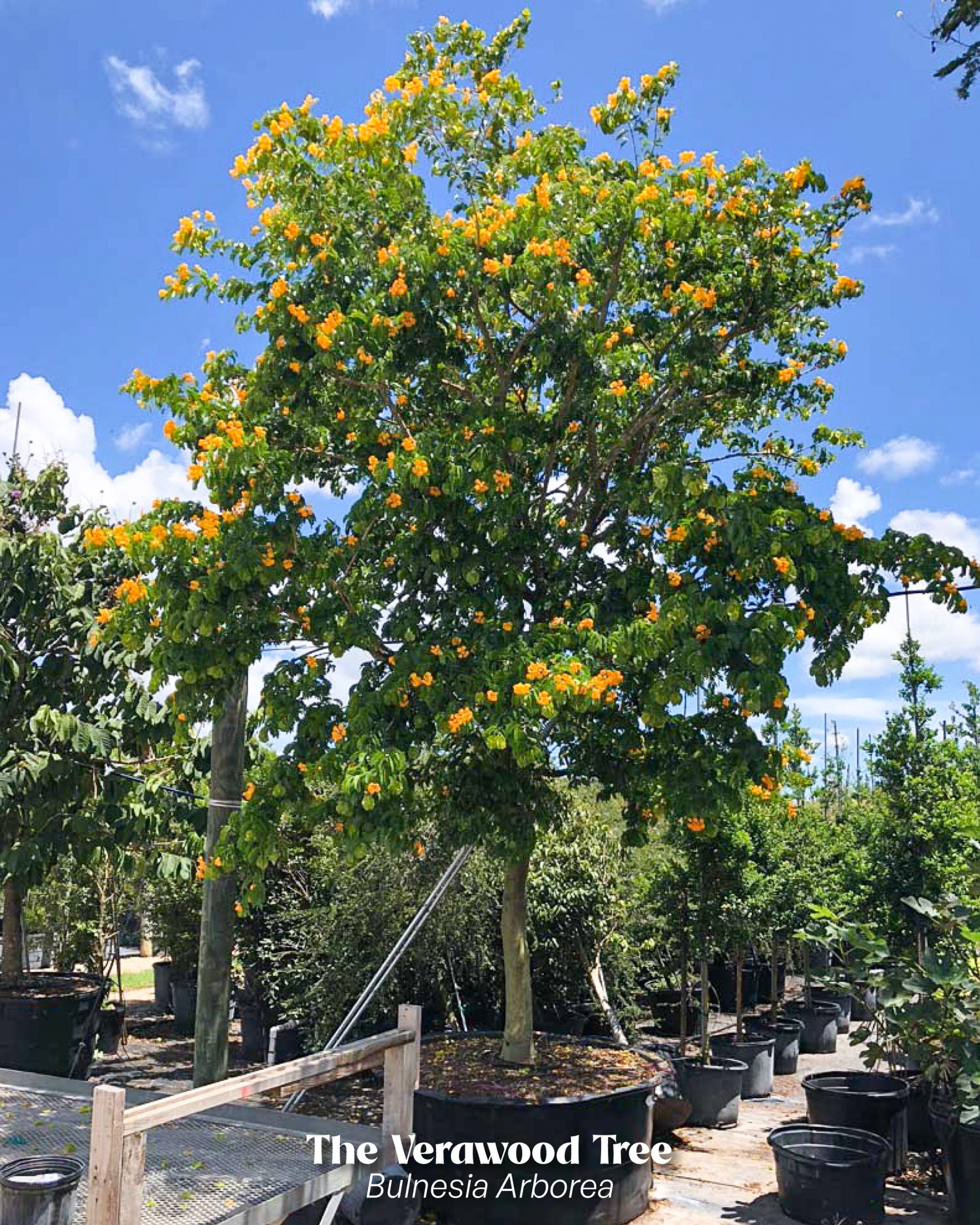 This tropical tree with yellow flowers in Florida grows to about 50 feet tall, with a clean, upright trunk that stays branch-free for up to 20 feet. Up top, it spreads out into a dense, finely branched crown that often grows wider than the tree is tall—great for adding shade. Check the Bulnesia arborea specifications chart for average sizes and gallon sizes.