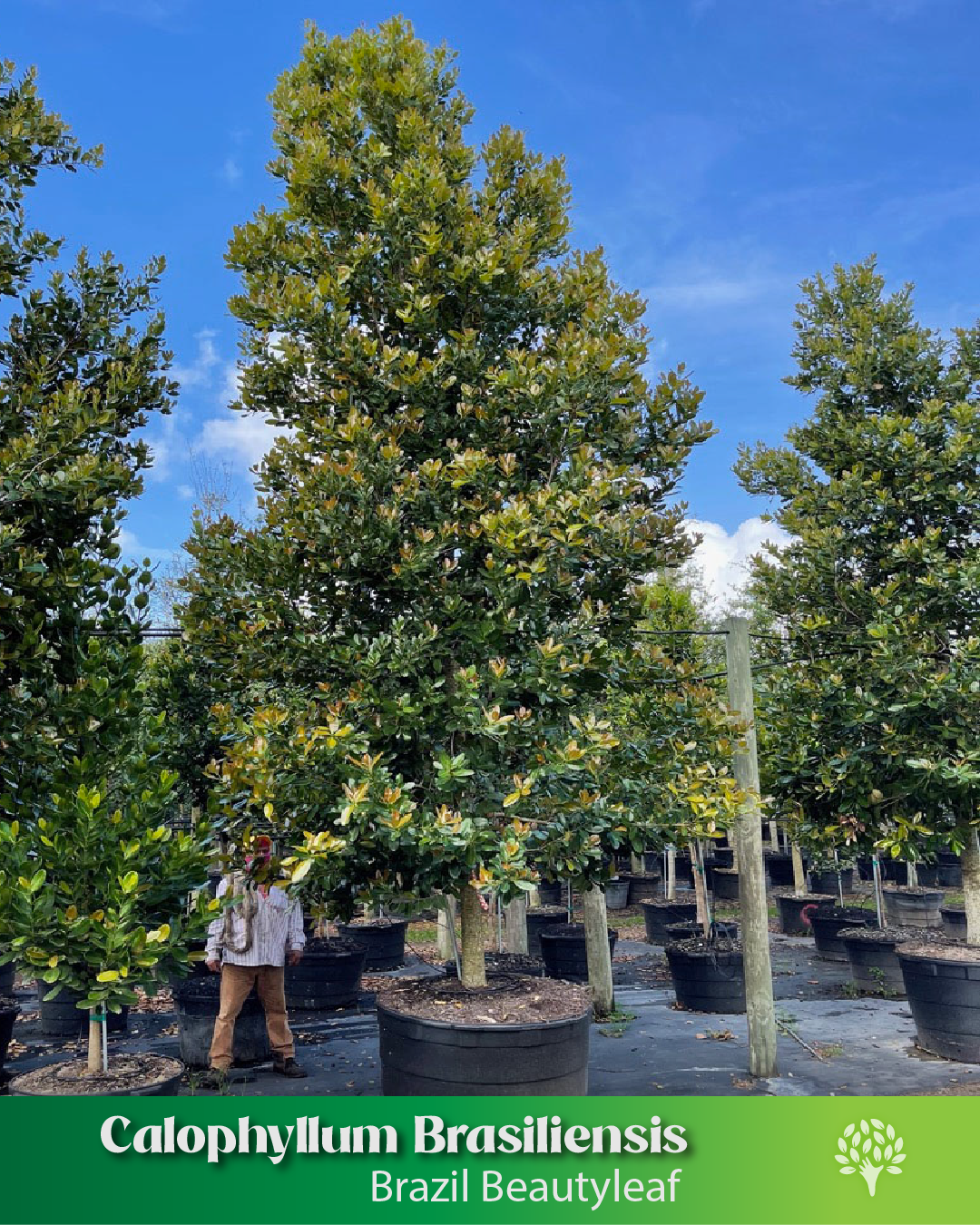 - Brazil Beautyleaf (Calophyllum brasiliense) → Dense crown, rounded canopy, salt tolerant, and glossy foliage that keeps landscapes vibrant year-round.
